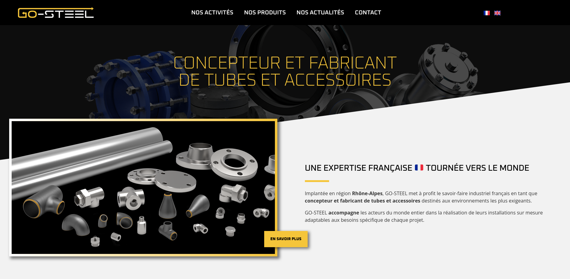 GO-STEEL, acteur industriel reconnu à l’international dans les secteurs du pétrole, du gaz, de la pétrochimie et des énergies, souhaitait affirmer son positionnement à travers une identité de marque forte et un site internet capable de valoriser la technicité de ses produits. L’enjeu était de traduire visuellement son expertise industrielle et de structurer une offre complexe pour la rendre claire et accessible à une audience internationale.